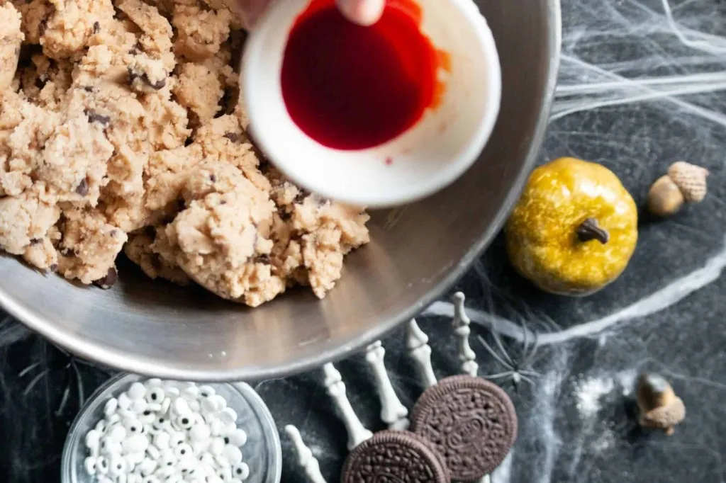 Add in the orange food coloring. For a more vibrant orange, mix yellow and red to reach your desired pigment and then pour into the dough.