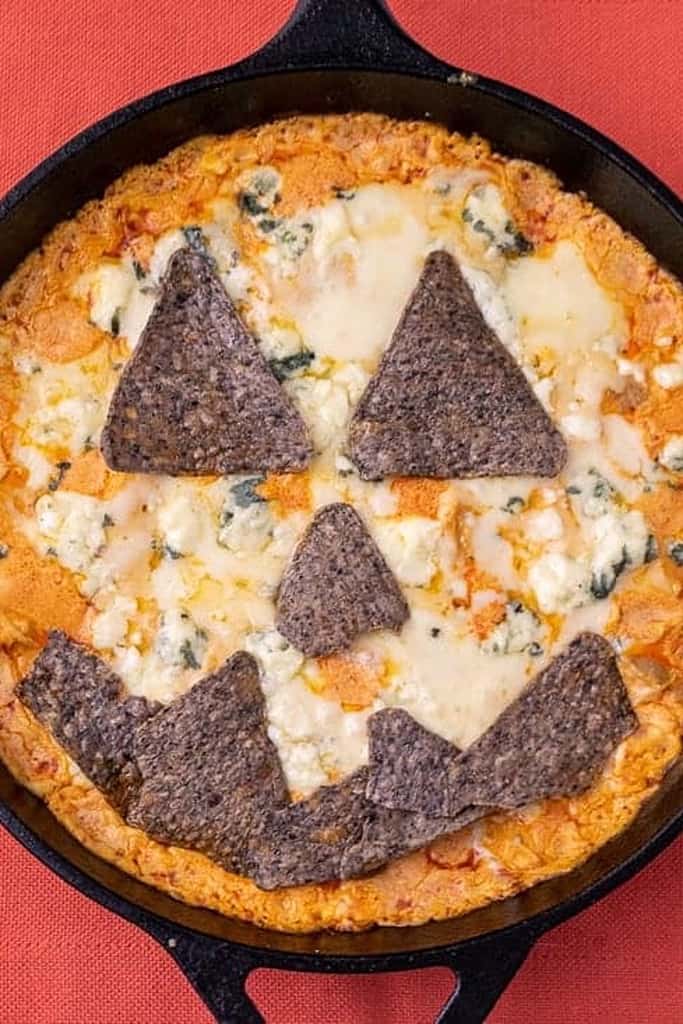 Boo-ffalo Chicken Dip Halloween buffalo chicken dip is a recipe baked in a cast iron skillet. A spooky jack-o-lantern face is added with black tortilla chips making this an easy and festive Halloween party dip. This spicy chicken dip can be made ahead of time making it a great appetizer for a crowd or Halloween party.