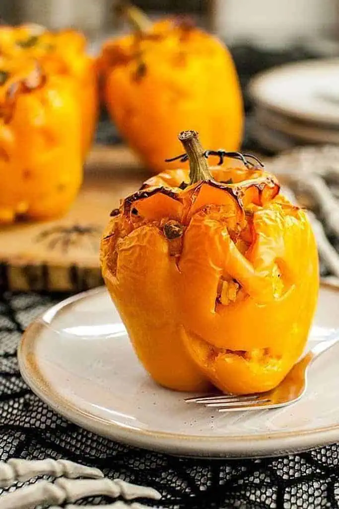 Jack-o-lantern Chicken Buffalo Dip These Halloween buffalo chicken jack-o-lantern stuffed peppers are super-easy to make, fun to look at, and of course theyโre delicious as well! If you are looking for Halloween party ideas for adults or kids, give these tasty peppers a try.