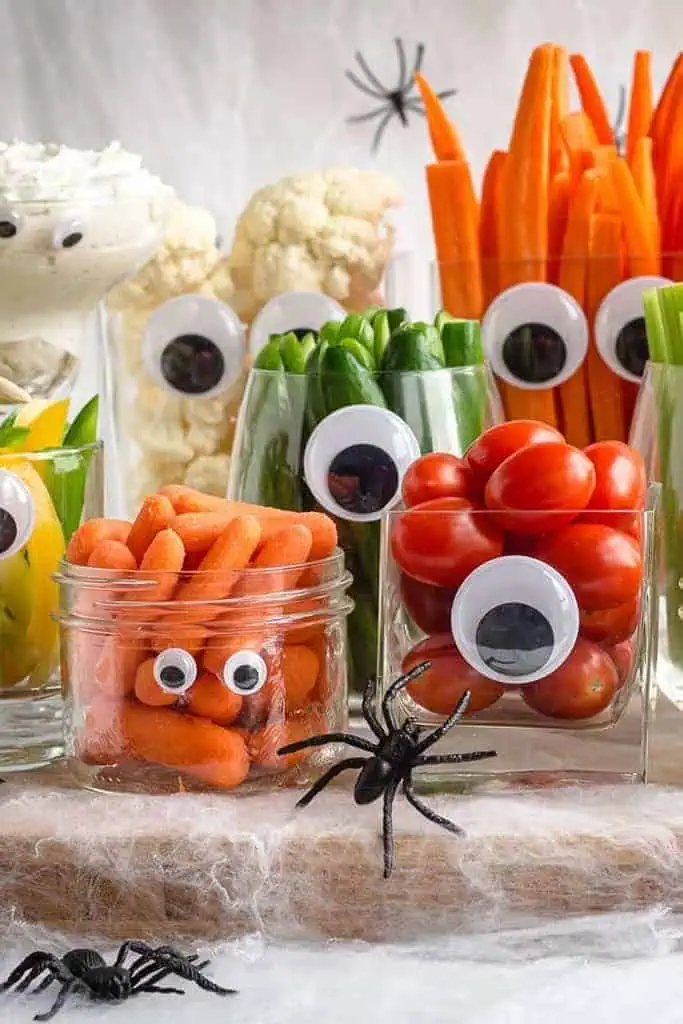 Spooky Veggie Tray If youโre looking to add a healthy Halloween potluck idea to the mix try this veggie tray. With all your favs like carrots and broccoli with hummus!