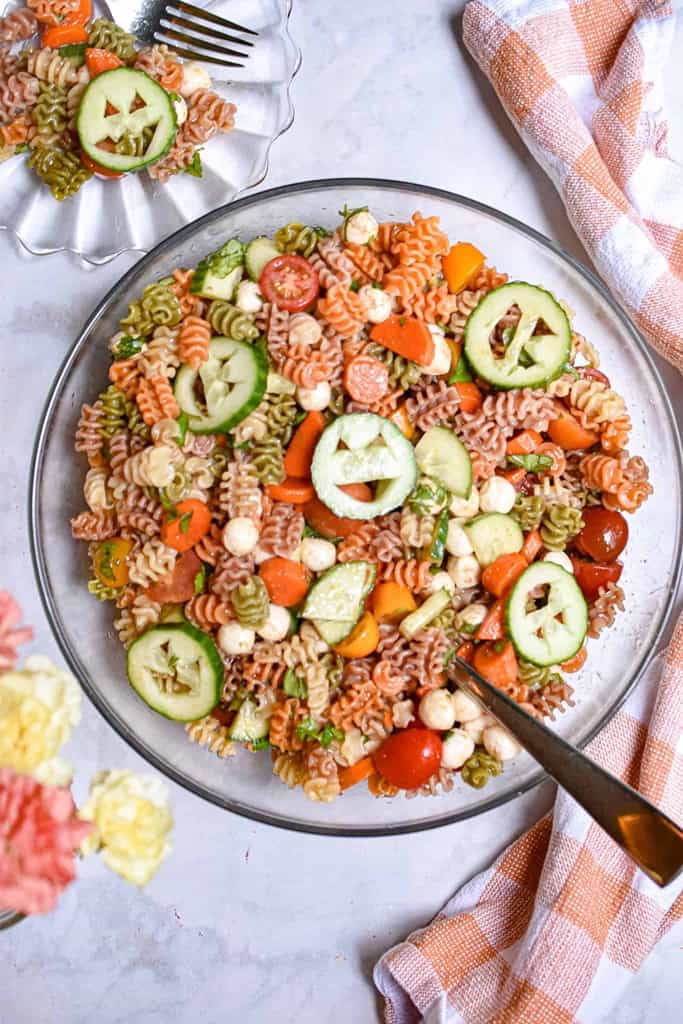 Halloween Pasta Salad Pasta salad isn't just for Summer anymore! This fun and delicious Halloween pasta salad is ready in less than 20 minutes and loaded with veggies! Serve this pasta salad on Halloween after trick or treating or on a spooky Halloween party buffet table!