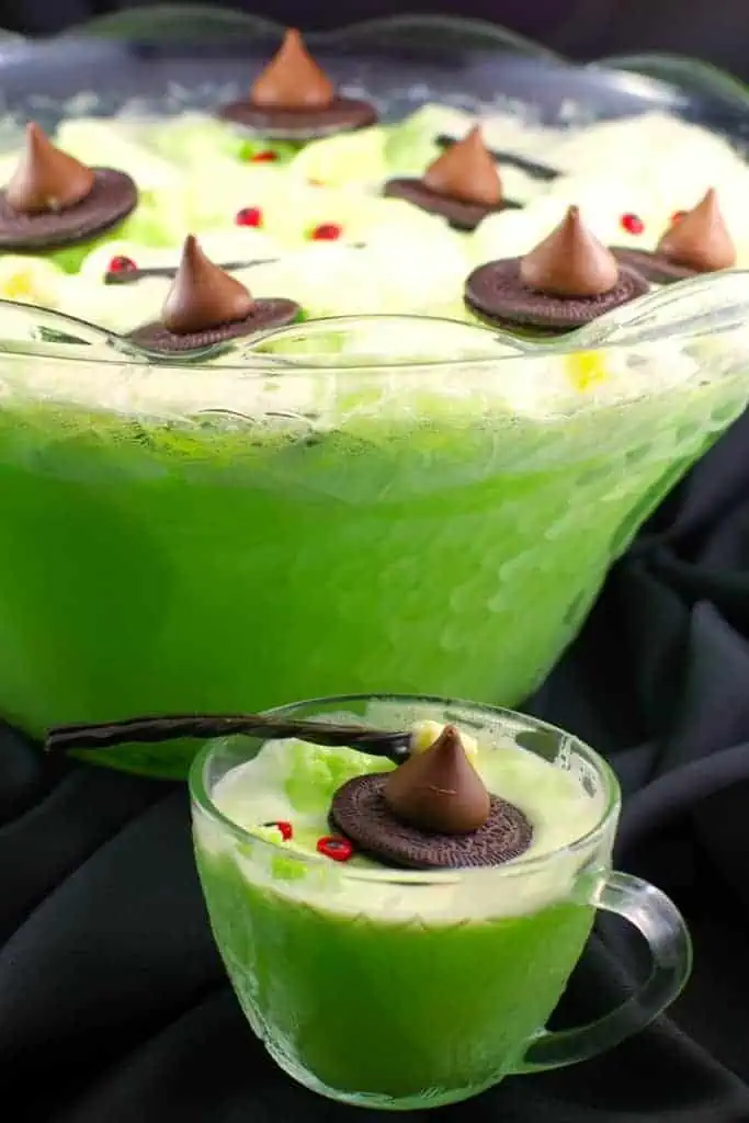 Green Witch Punch The kids will adore this one which has ingredients like: ice cream, limeade, soda pop, candy, marshmallows, chocolate and cookies! It doesn't get much kid friendlier than that.
