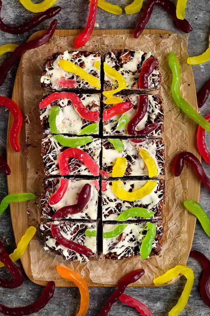 Spooky Rocky Road Halloween Rocky Road is fun, delicious and an ideal sweet treat or edible gift. It is a favorite no-bake dessert for chocolate lovers. Dark and milk chocolate are combined with rice bubble cereal, marshmallows and snake lollies. Decorated with a drizzle of white chocolate for a spider web effect and more snakes, this is the ideal festive Halloween treat!