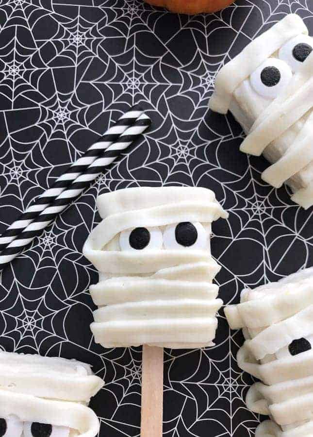 These fun and easy mummy rice Krispie treats are super cute and quick to make! These are the perfect last-minute Halloween treat.