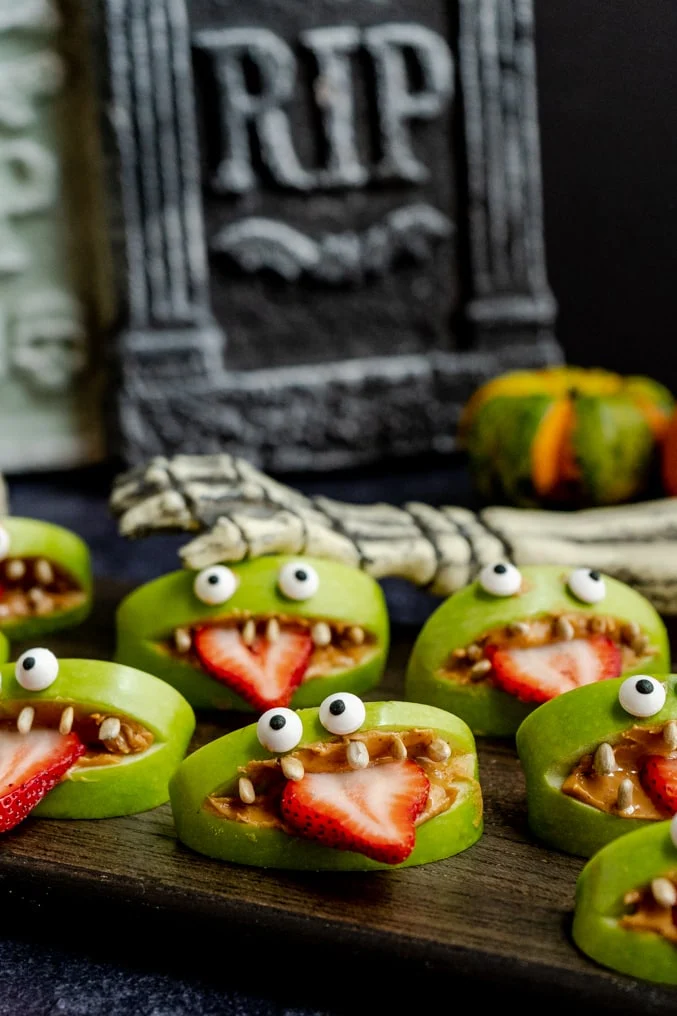 Spooky Halloween Monster Apple Snacks are made with peanut butter, strawberries, and sunflower seeds. A ghoulish Halloween snack for the kids without all the added sugar. Ghosts, ghouls, and sugar are the hallmarks of Halloween and as a kid, it is one of the best times of the year. You get to get dressed up, stay up a little late, and eat boatloads of candy.