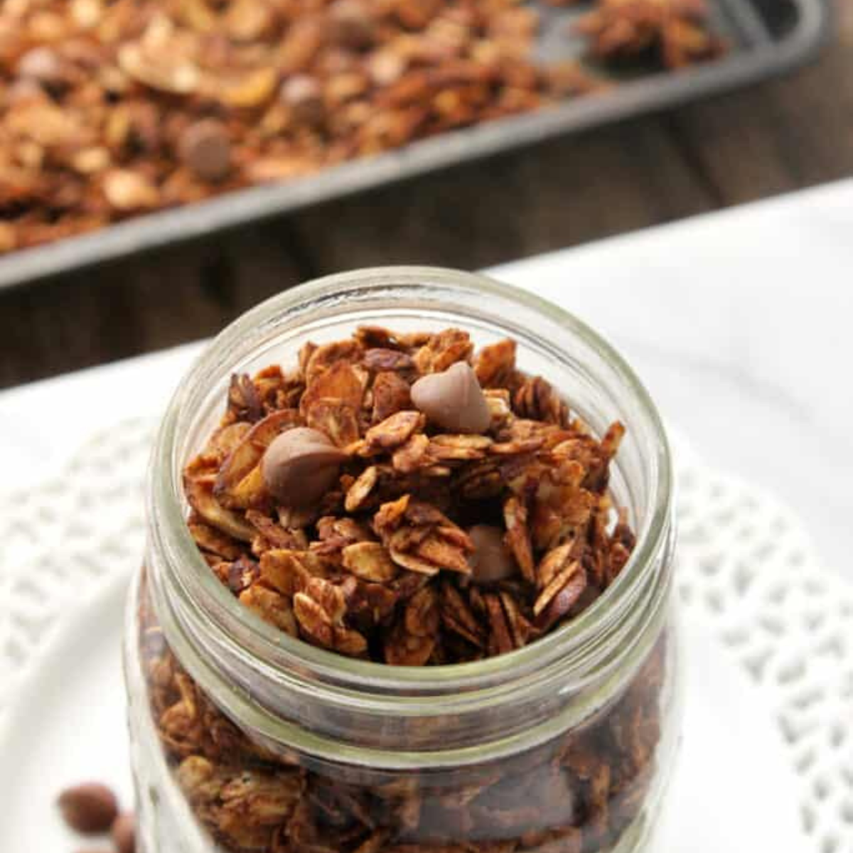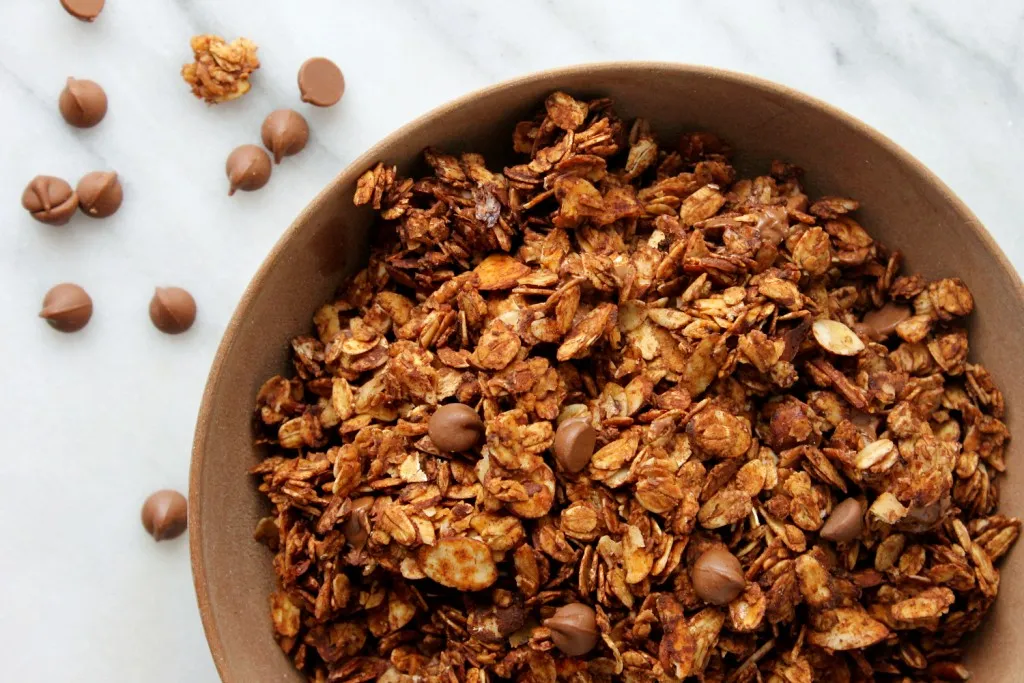This delicious granola consists of old-fashioned oats, crunchy sliced almonds, coconut oil, maple syrup, chocolate chips, vanilla extract, cinnamon, and cocoa powder. Once combined, the granola is baked, cooled, and then sprinkled with a generous amount of chocolate chips before being enjoyed with milk, yogurt, or used as a topping in smoothie bowls or over ice cream!