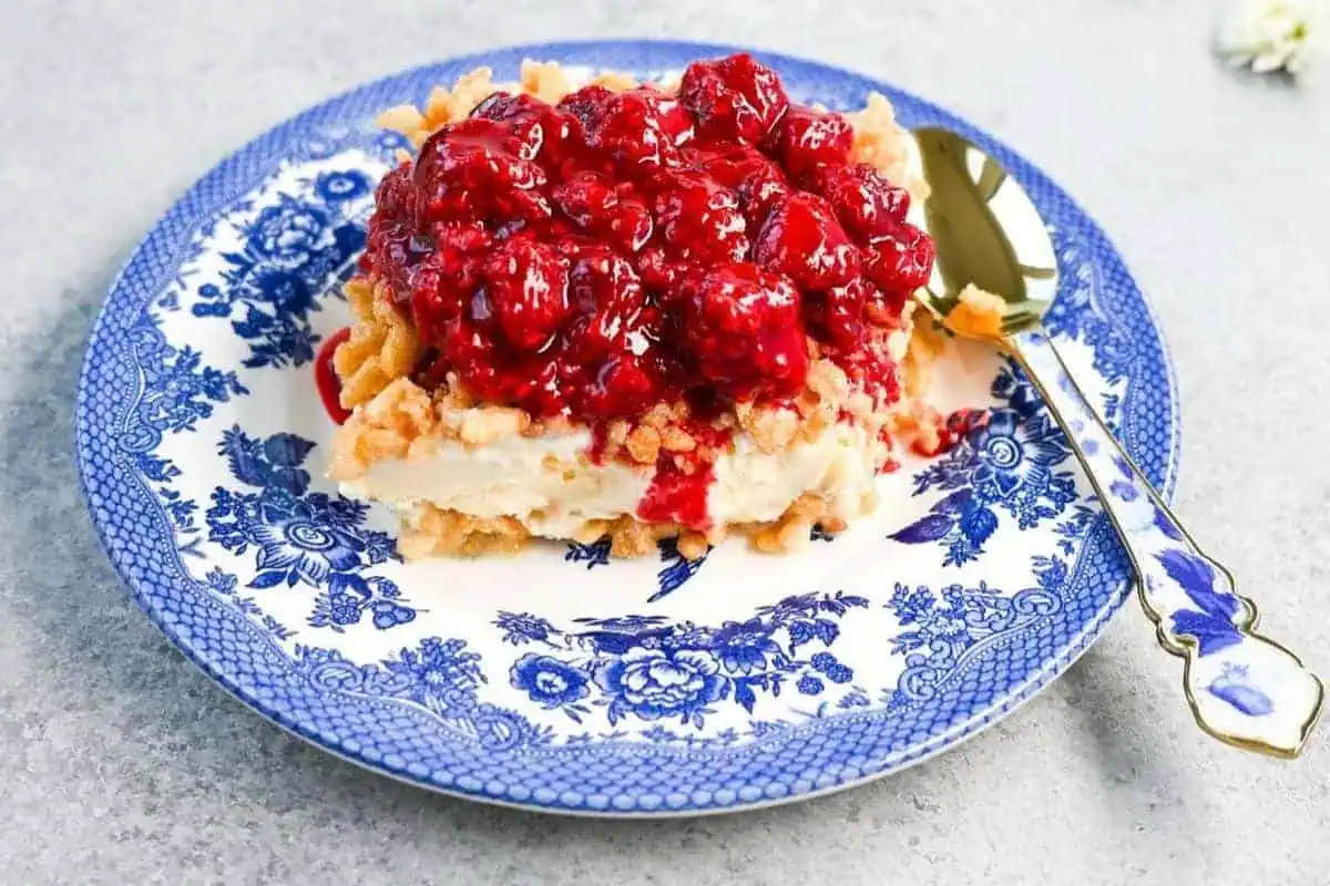This layered delight starts with vanilla ice cream and adds a crunchy cereal crumb layer and drizzles juicy red raspberries over the top for a crunchy munchy dessert that is perfect for sharing.