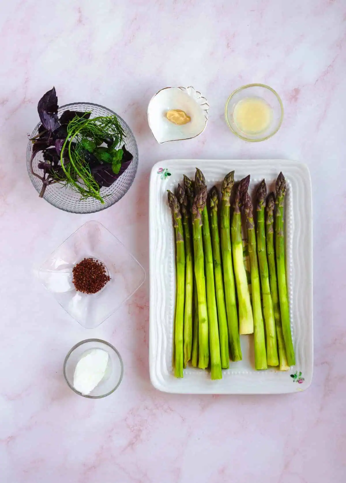 6. Top asparagus with lemon dressing and garnish with chili flakes, dill, purple basil and fresh mint.