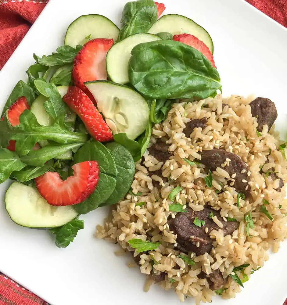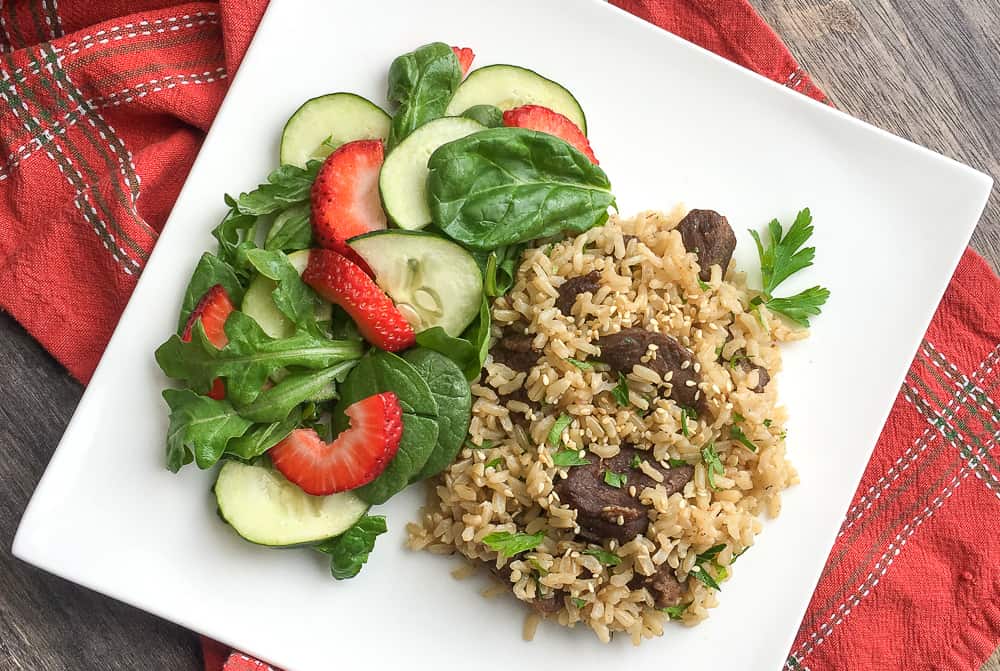 I like to serve my beef and rice with a simple side salad. I usually use a ginger based dressing because I think it gives a fresh and zesty zing to a salad with this hearty dish. I have also served with roasted or steamed vegetables. Sometimes I even get a little creative and whip up a quick vegetable stir fry to go with my beef and rice.
