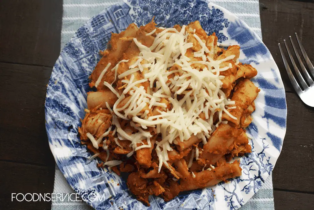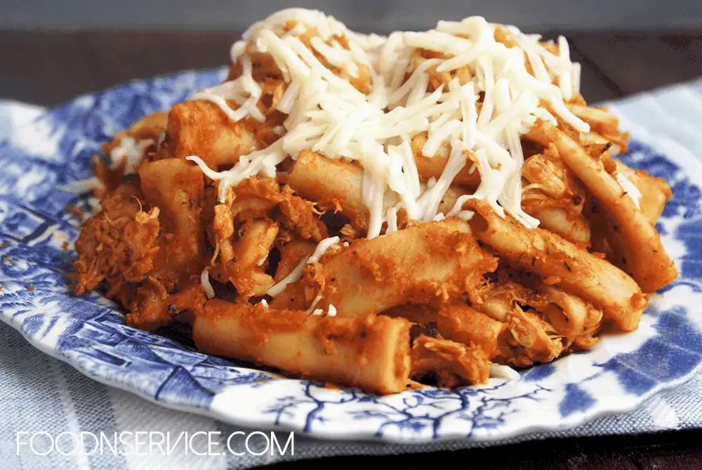 2. Add the pasta over the chicken. Then add chicken broth and be sure to scrape off any bits from the bottom that might have gotten stuck. Then you can add your pasta sauce, pepper flakes, salt, garlic powder, thyme, and oregano. DO NOT STIR! Leave ingredients layered as is.