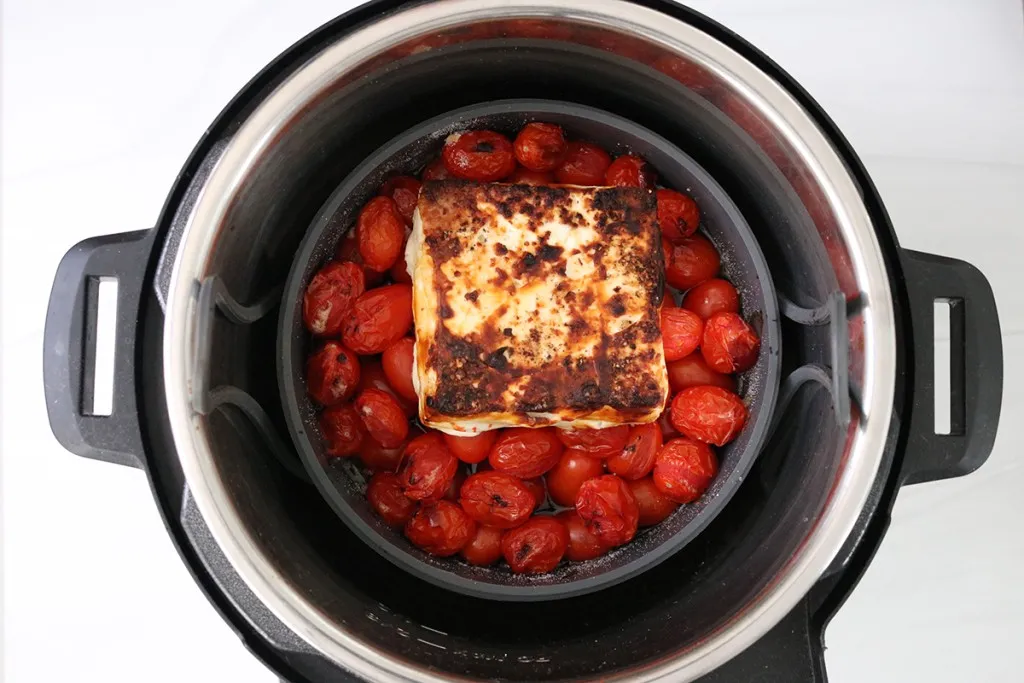 - In Instant Pot safe dish, add cherry tomatoes and place feta cheese on top. PLEASE make sure your liner is in the machine!