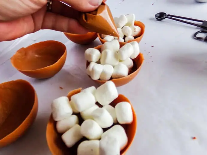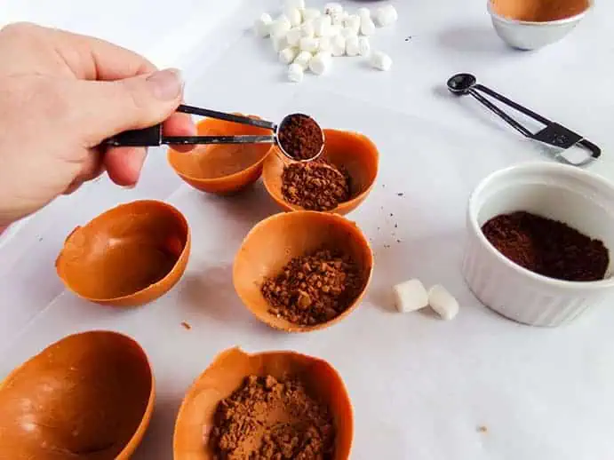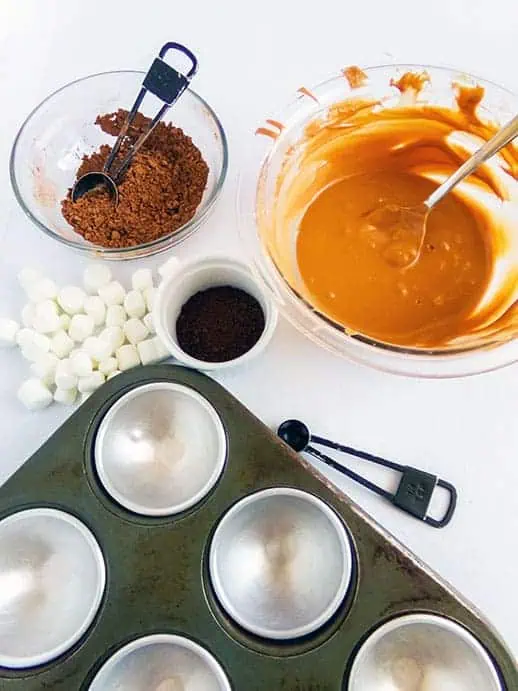 - Fill 6 of the molds with 2 tbsp hot chocolate mix and 6-8 mini marshmallows.