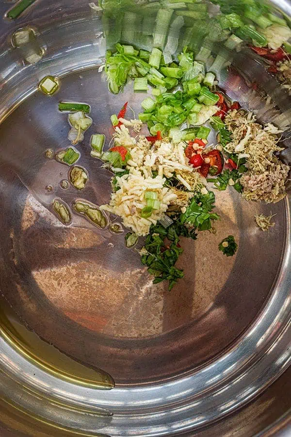 - Add the green onions, coriander, garlic, ginger and chili. Sauté for 2 minutes, stirring frequently