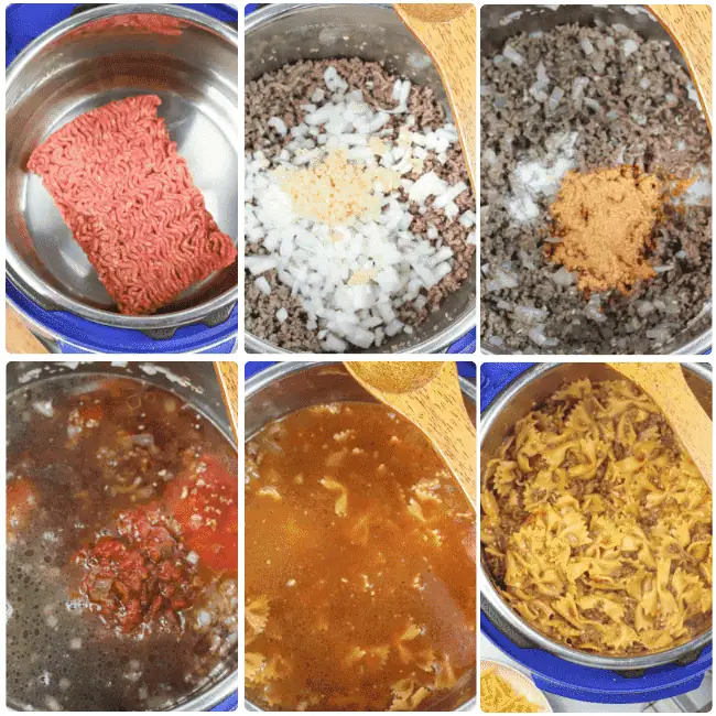 • The pasta must be covered in liquid before you set your Instant Pot to cook. Push your pasta down with a spatula, keeping the ground beef at the bottom so that the pasta doesn’t stick to the bottom of the pot while cooking.