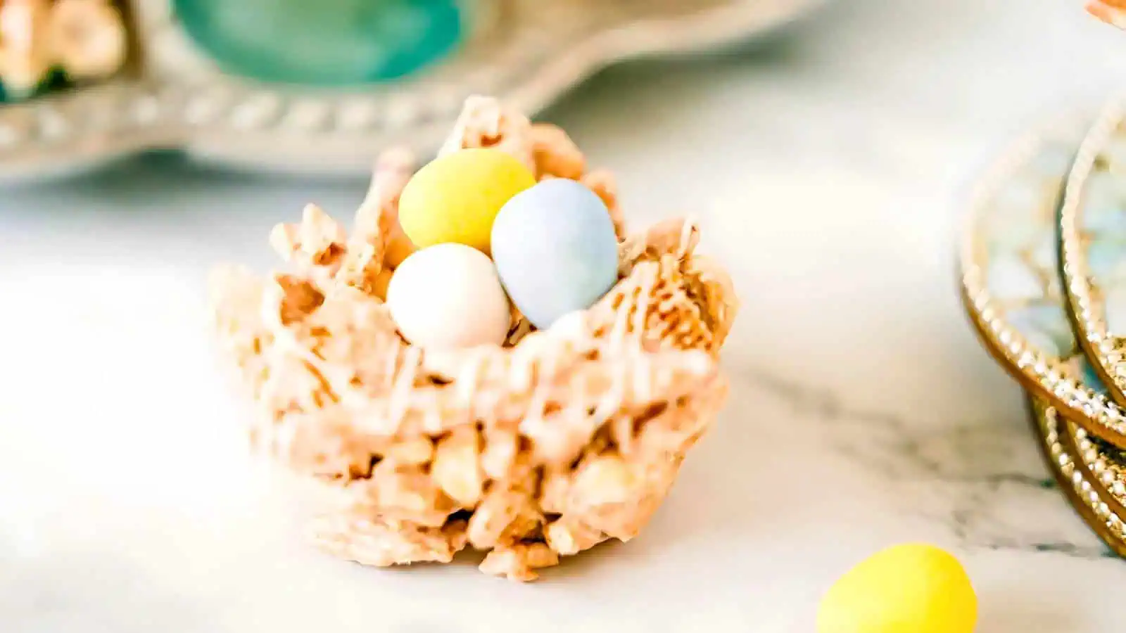 These marshmallow-filled, crunchy treats get a festive upgrade with mini chocolate eggs and colorful decorations. A simple, no-bake option, theyโre perfect for kids friendly Easter recipes. Let the kids help mix and shape them for a fun Easter activity!