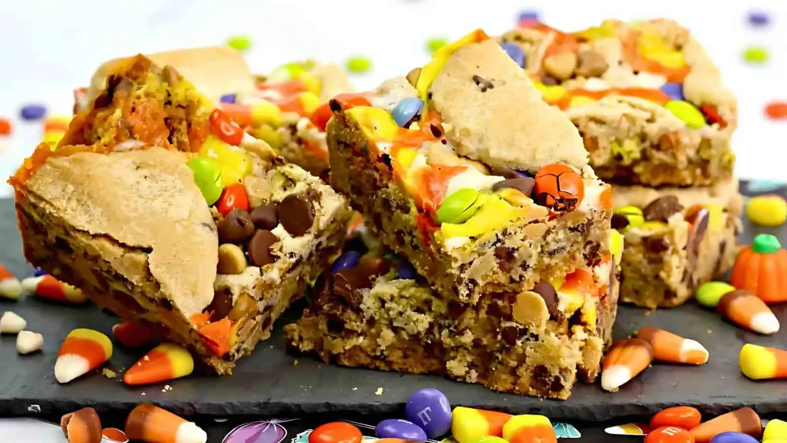 Packed with candy, these monster cookie bars are a great way to repurpose your leftover sweets. Theyโre one of the most fun leftover Halloween candy recipes you can try, offering a mix of chocolate, peanut butter, and candy in every bite. Perfect for parties or family treats!