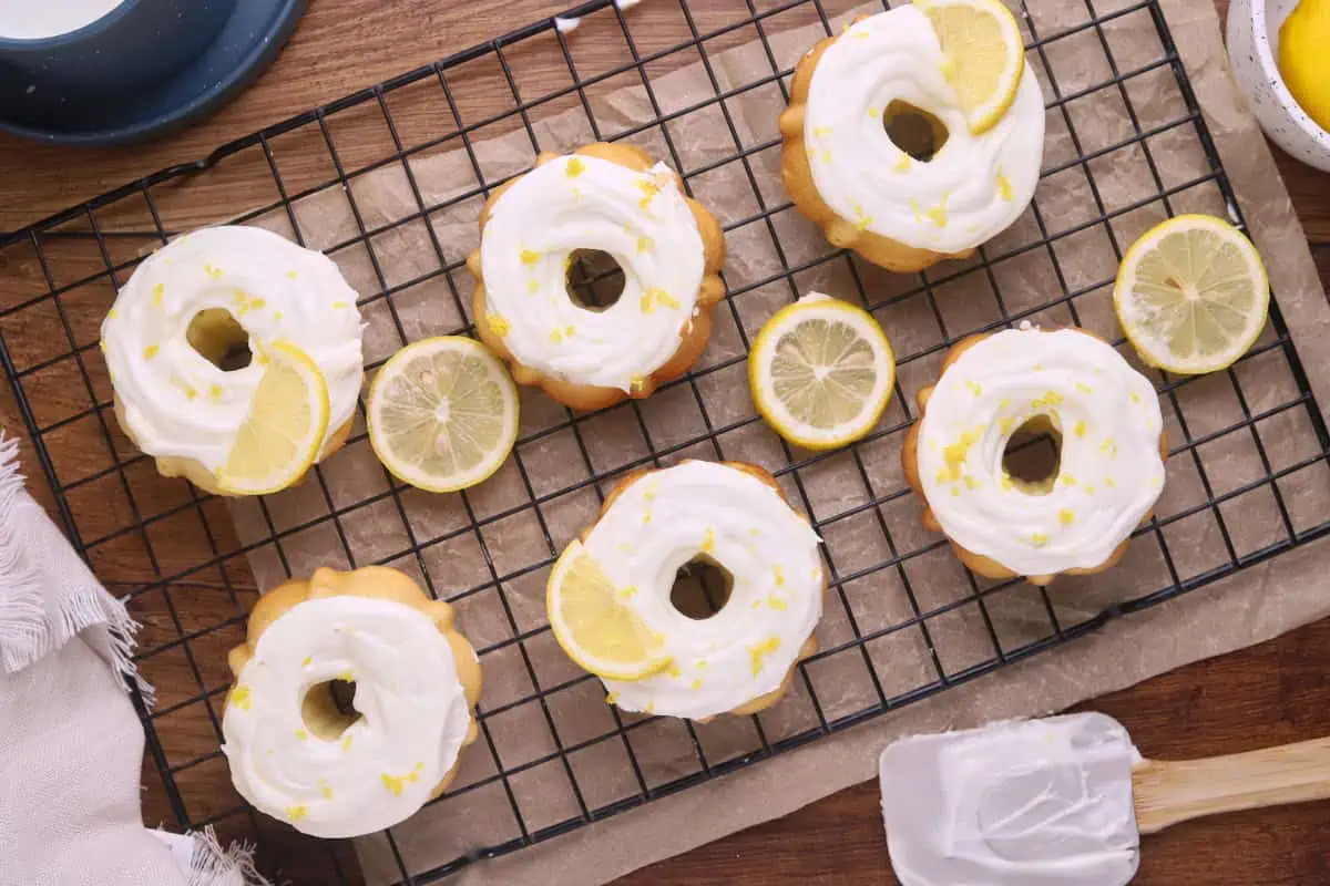 6. Pipe or spread the frosting on top of the cooled bundt cakes. If desired garnish with lemon zest and a lemon slice and serve.