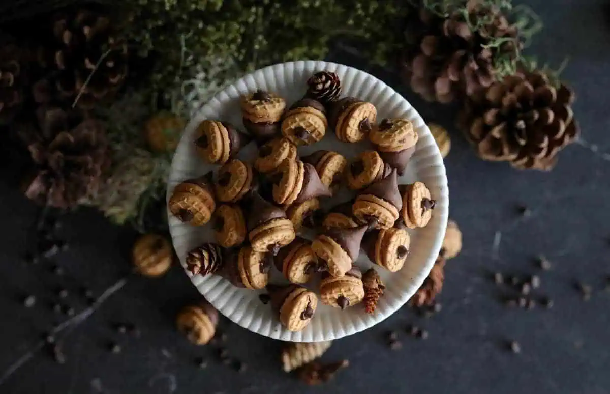 You can store these Nutter Butter acorns in a parchment-lined airtight container at room temperature for 3-4 days or in the refrigerator for up to 5 days. Bear in mind that storing these edible cookie acorns in the refrigerator may lead to the cookies going slightly soft so it’s best to eat them as soon as possible after storage.