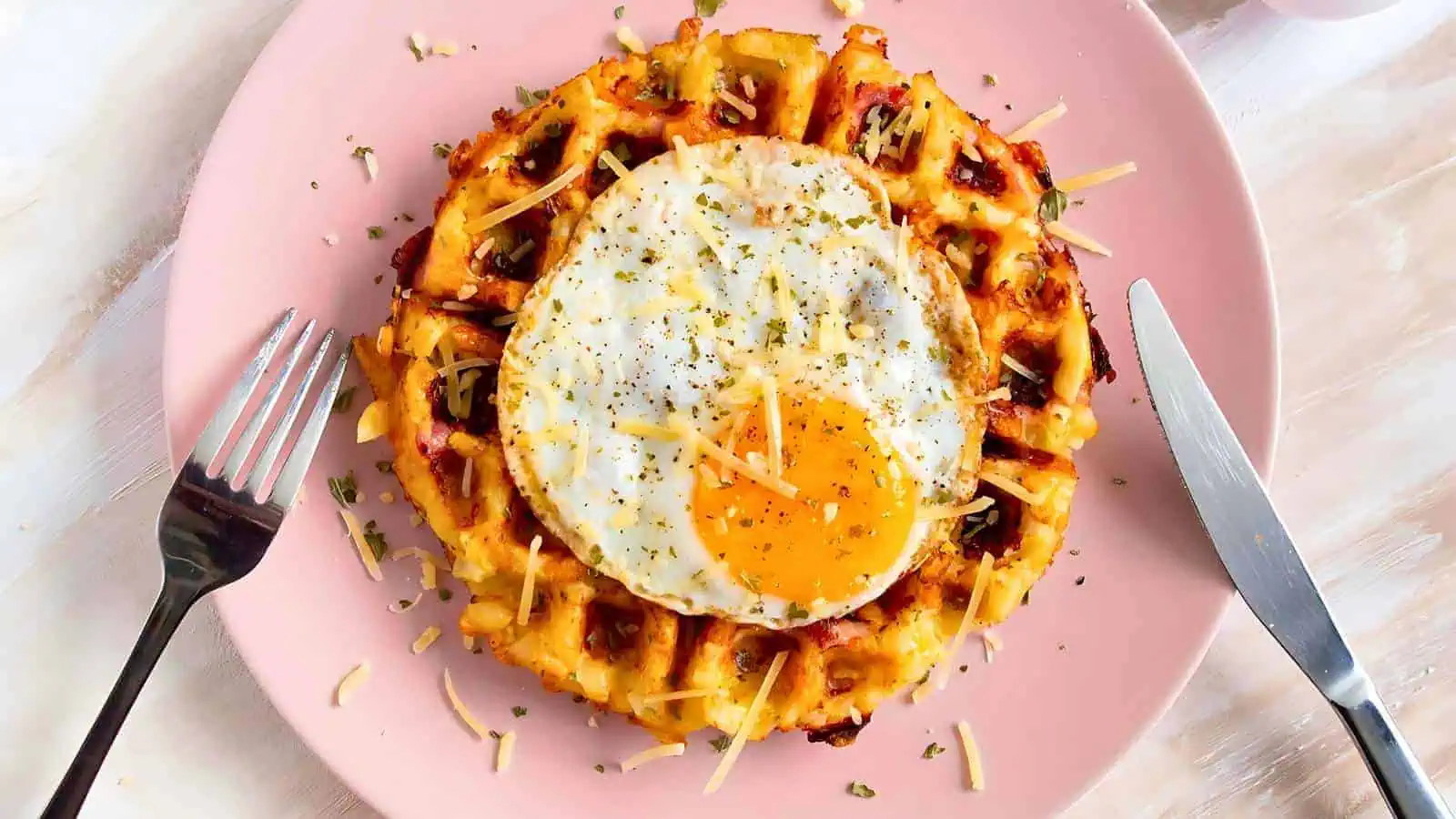 Ham & Cheese Hash Brown Waffle fits perfectly into over the top waffle recipes with its savory blend of ham, cheese, and crispy hash browns. Topped with a fried egg, this waffle makes a hearty and delicious breakfast thatโs ideal for special occasions like National Waffle Day.