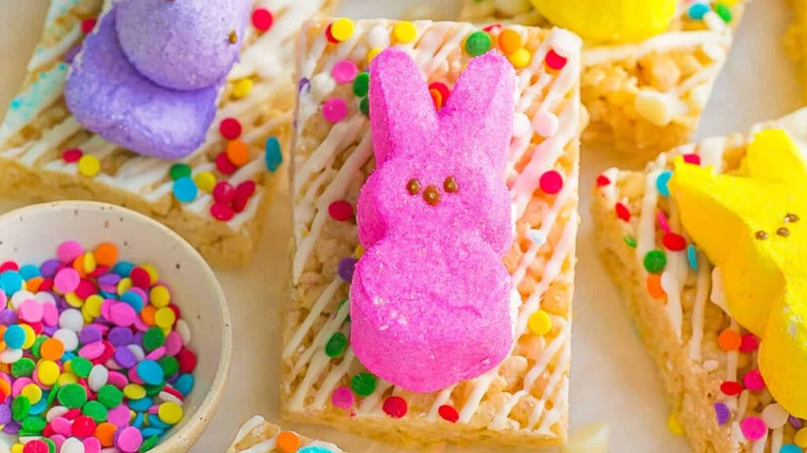 Peeps Rice Krispie Treats bring the crunch with a whole lot of color. Topped with white chocolate and sprinkles, this cheerful snack earns its Easter badge with every gooey bite.