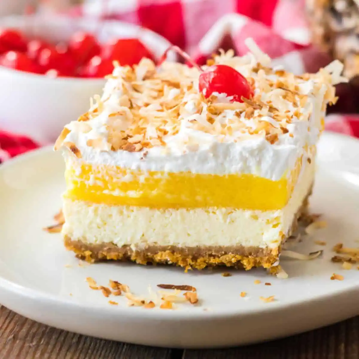 This cocktail-inspired dessert consists of a buttery cracker crust, cheesecake filling, and a pineapple layer made from pudding mix and pineapple-flavored gelatin. It’s topped with whipped topping, sweetened shredded coconut, and juicy-sweet maraschino cherries!