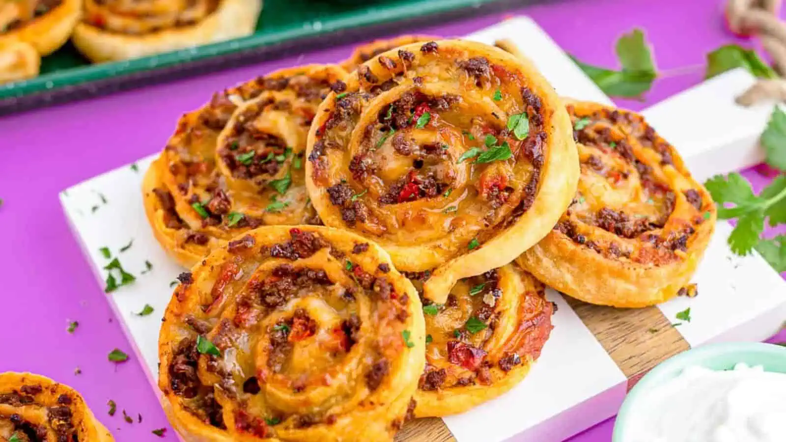 These puff pastry pinwheels are loaded with ground beef, cheese, and taco seasoning. Theyโre quick to prep and easy to serve at any party. This is a fun way to enjoy taco night in bite-sized form. If you're looking for puff pastry recipes with bold flavor, this one delivers.