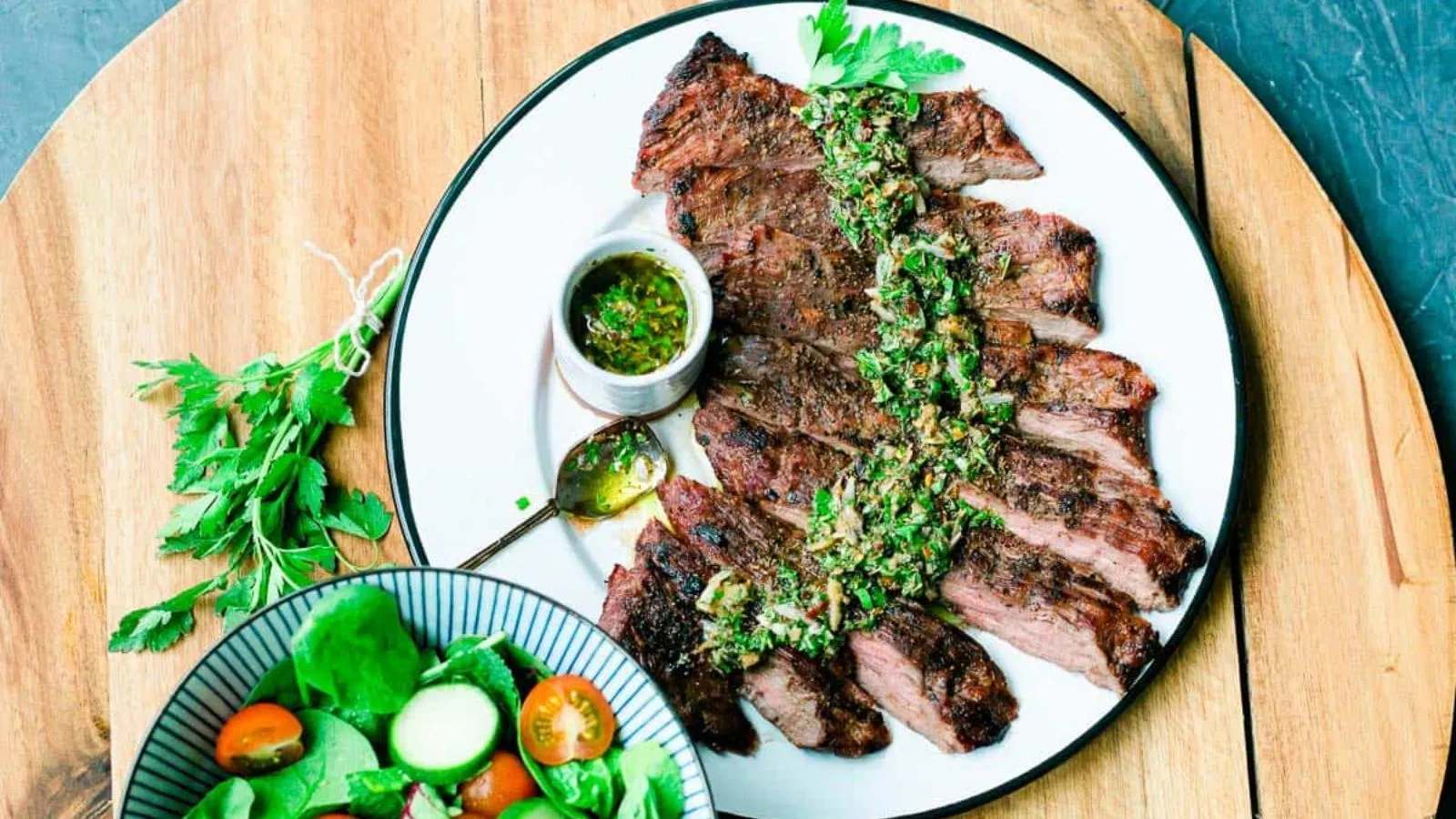 Skirt steak hits the grill fast and comes out tender if you don't overdo it. Chimichurri on top keeps it fresh and bold without needing anything else.