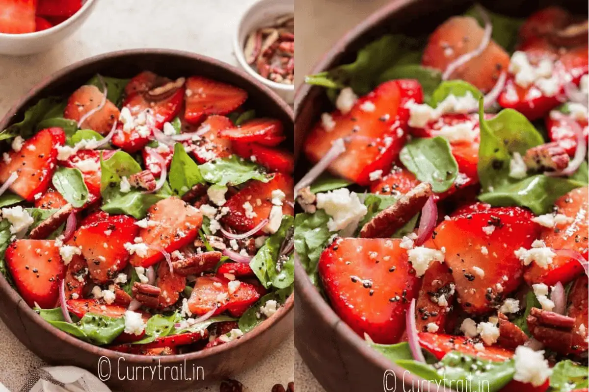 Strawberry spinach salad with poppy seed dressing is great as a side dish, and terrific as a light meal. It’s light and healthy. Poppy seed dressing adds wonderful flavor to the salad.