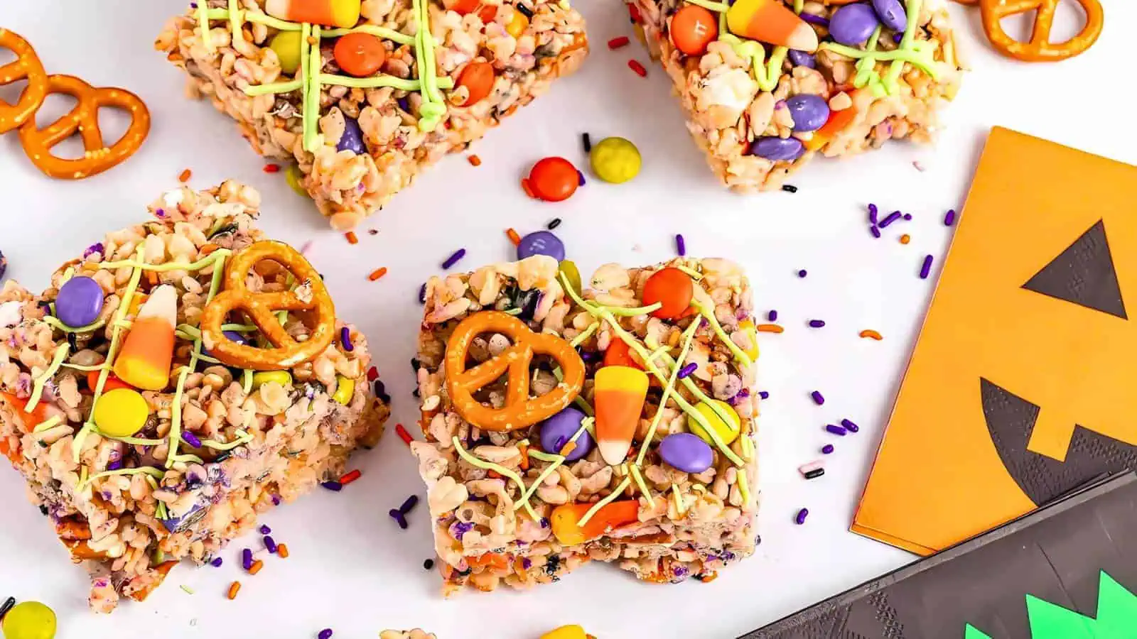Halloween Rice Krispy Halloween Treats are the ultimate easy snack for your spooky gatherings. Gooey marshmallows and crunchy bits of candy make these treats a fun and delicious option. Best of all, they come together fast without any baking required.