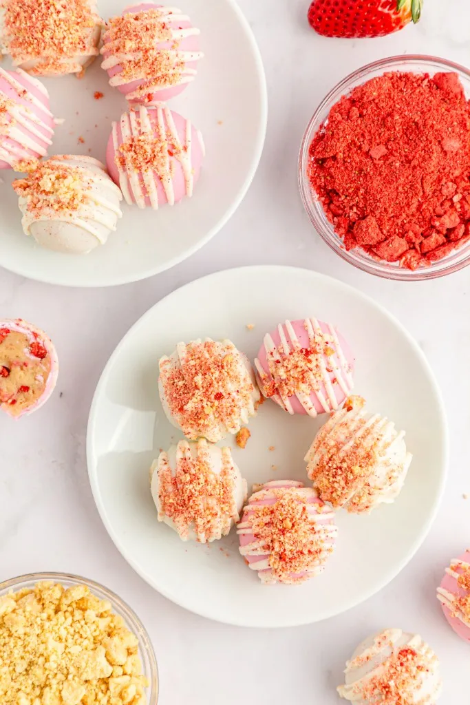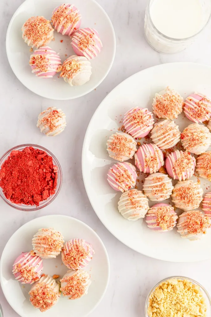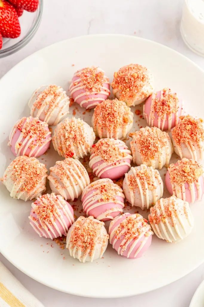 In the fridge: Store the Strawberry Crunch Cake Balls in an airtight container in the refrigerator for up to 5 days.