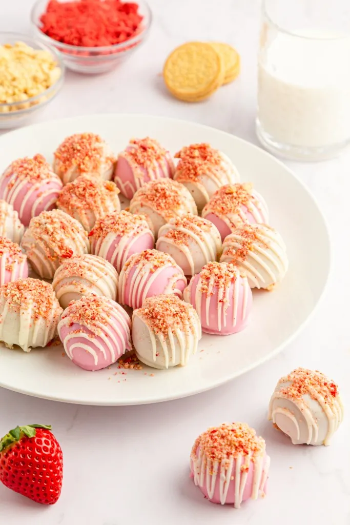 What are strawberry crunch cake balls? Well, imagine a world where strawberries, cream cheese, and Oreos come together in a perfect harmony of flavors. Luscious golden Oreo crumbs and freeze-dried strawberry bits mixed with creamy, smooth cream cheese. It's like a strawberry party in your mouth!