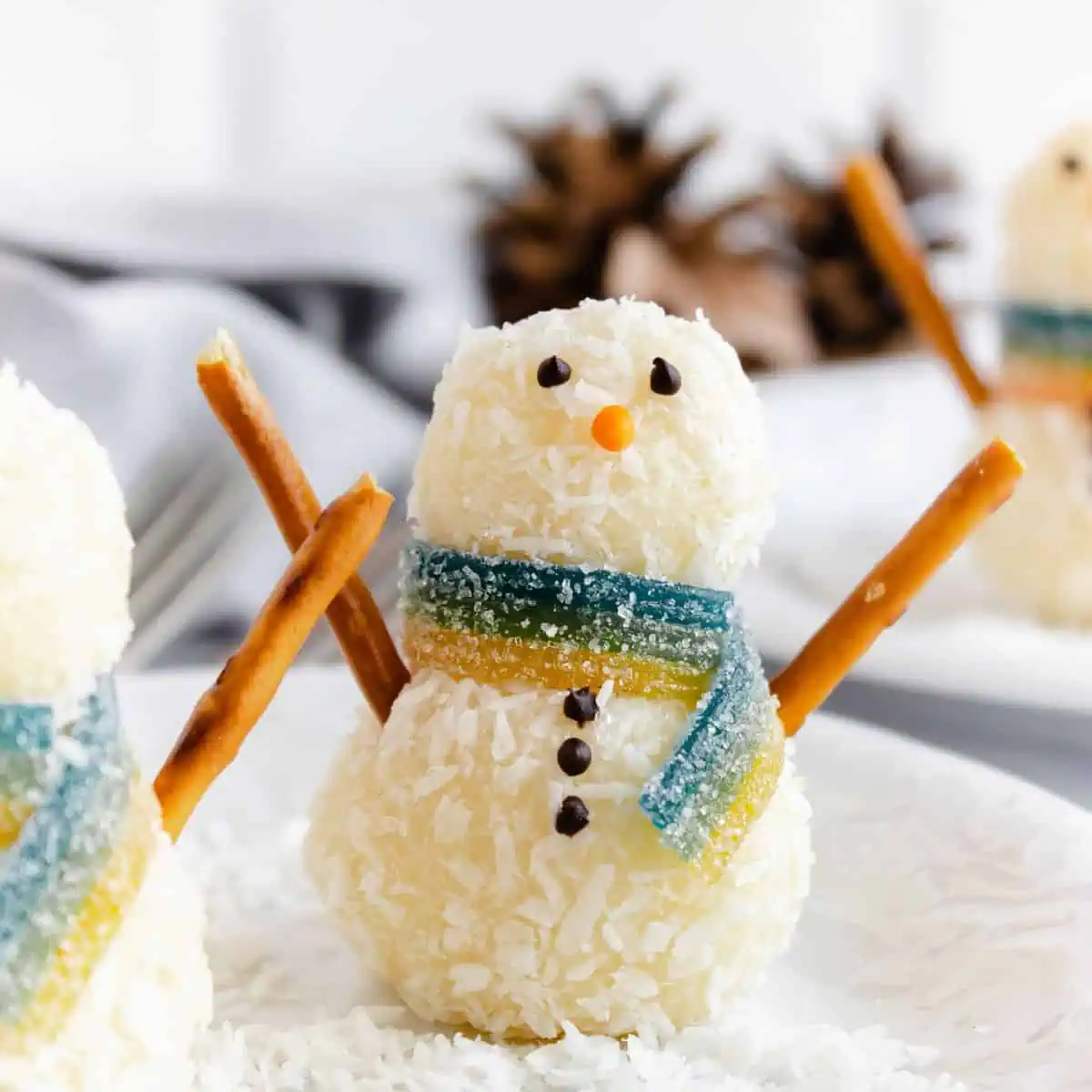 These snowman truffles can be assembled without the pretzel sticks and stored in an airtight container in the fridge for 2-3 days ahead of Christmas or your holiday celebrations. Insert the pretzel sticks just before serving.