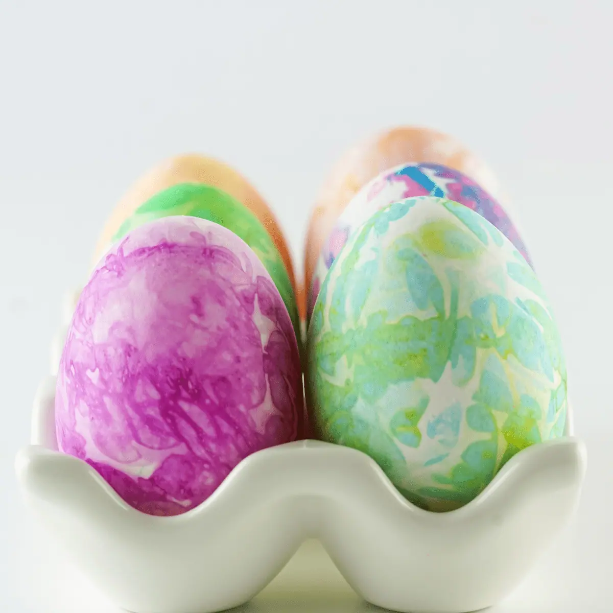 multi-colored eggs dyed with bleeding tissue paper in a ceramic egg holder