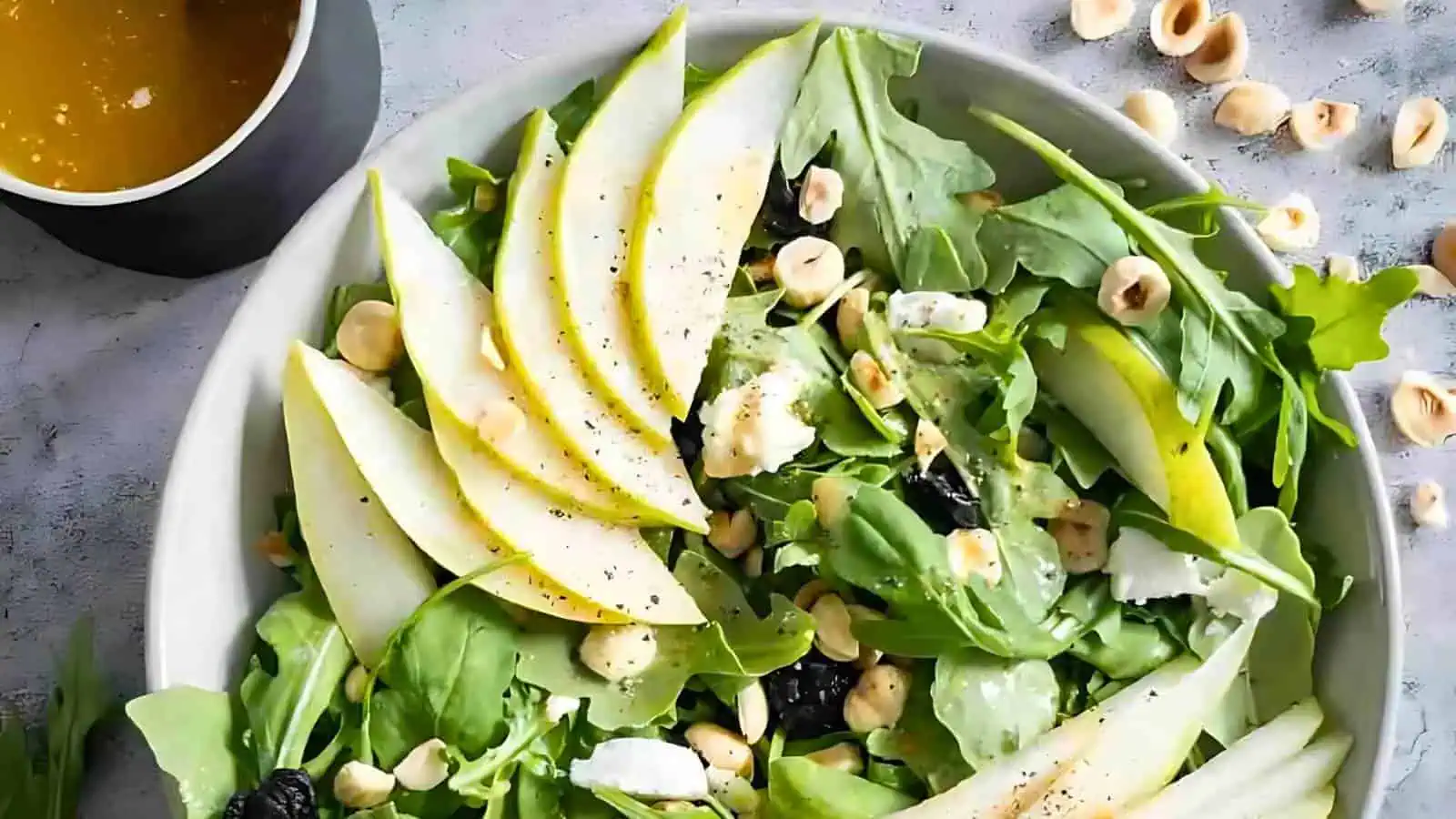 Arugula Pear Salad with Hazelnuts and Brown Butter Vinaigrette is a great option for vegetarian recipes for fall. The combination of arugula, sweet pears, and crunchy hazelnuts, dressed with a rich brown butter vinaigrette, makes for a delicious and festive salad.