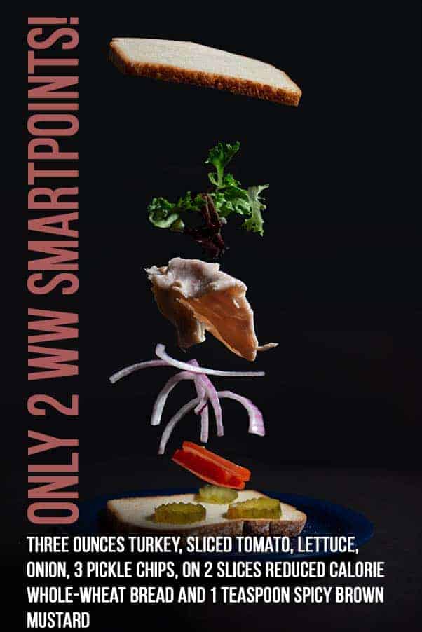 - Three ounces turkey, sliced tomato, lettuce, onion, 3 pickle chips, on 2 slices reduced calorie whole-wheat bread and 1 teaspoon spicy brown mustard