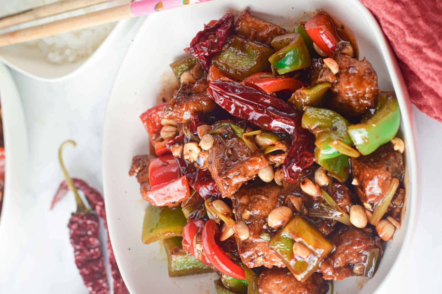 - Add dried red chilies and cubed red and green bell peppers. Stir fry it for a few seconds.