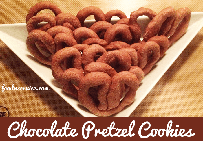 Lightly flour your hands, and start pulling your dough and rolling into 9 inch long ropes. Bring the ends together and pull to center of cookie to make a pretzel.