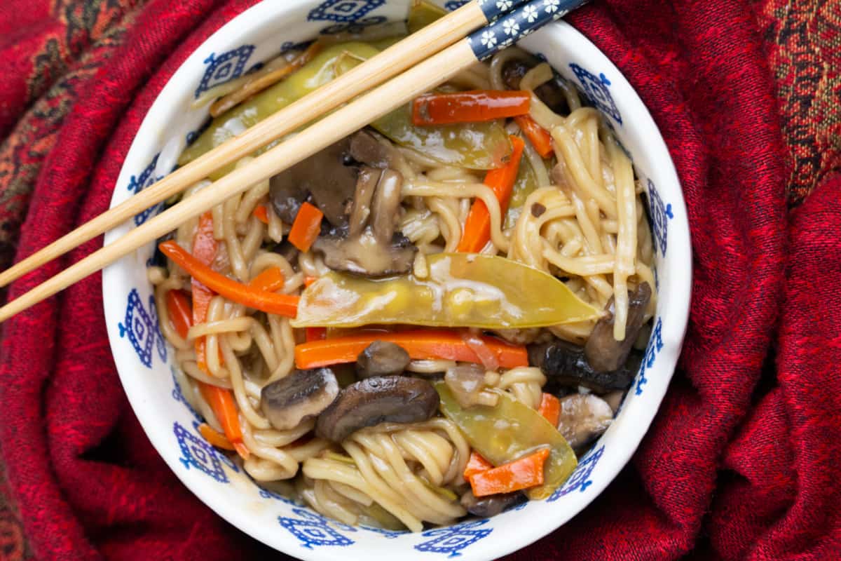 - Add uncooked lo mein, carrots, mushrooms, and snow peas