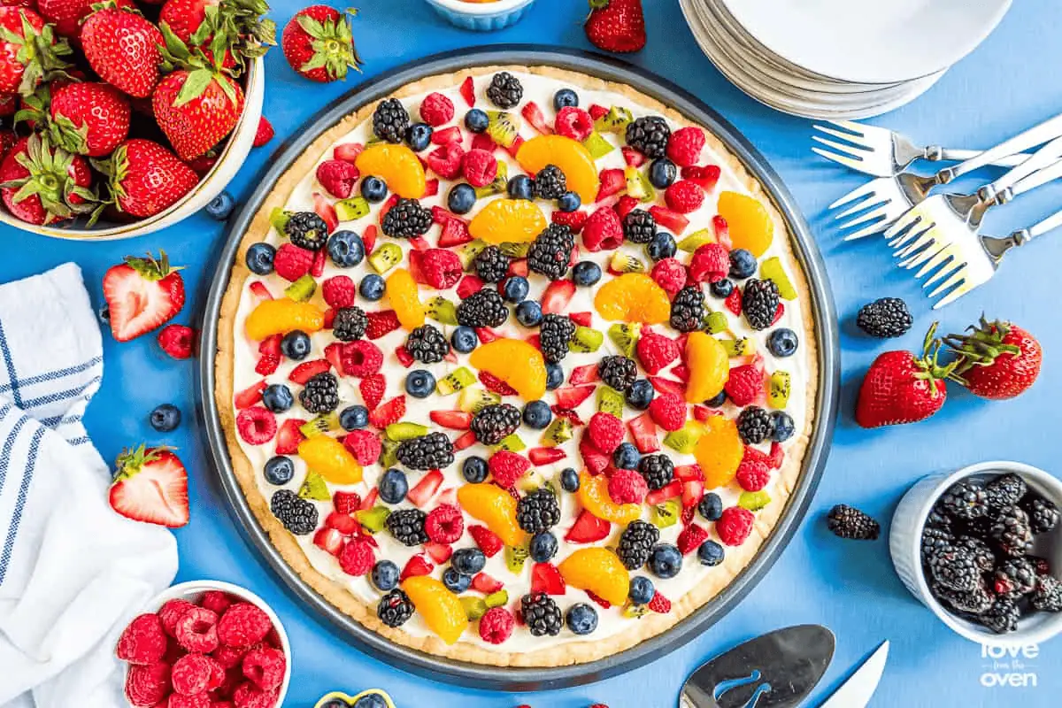This recipe for a Sugar Cookie Fruit Pizza is a wonderfully sweet and refreshing dessert that will brighten any day with it's flavors and beautiful colors! With a sugar cookie crust, a light cream cheese frosting, and fresh fruit, this treat is sure to satisfy your sweet tooth on a hot Summer day.