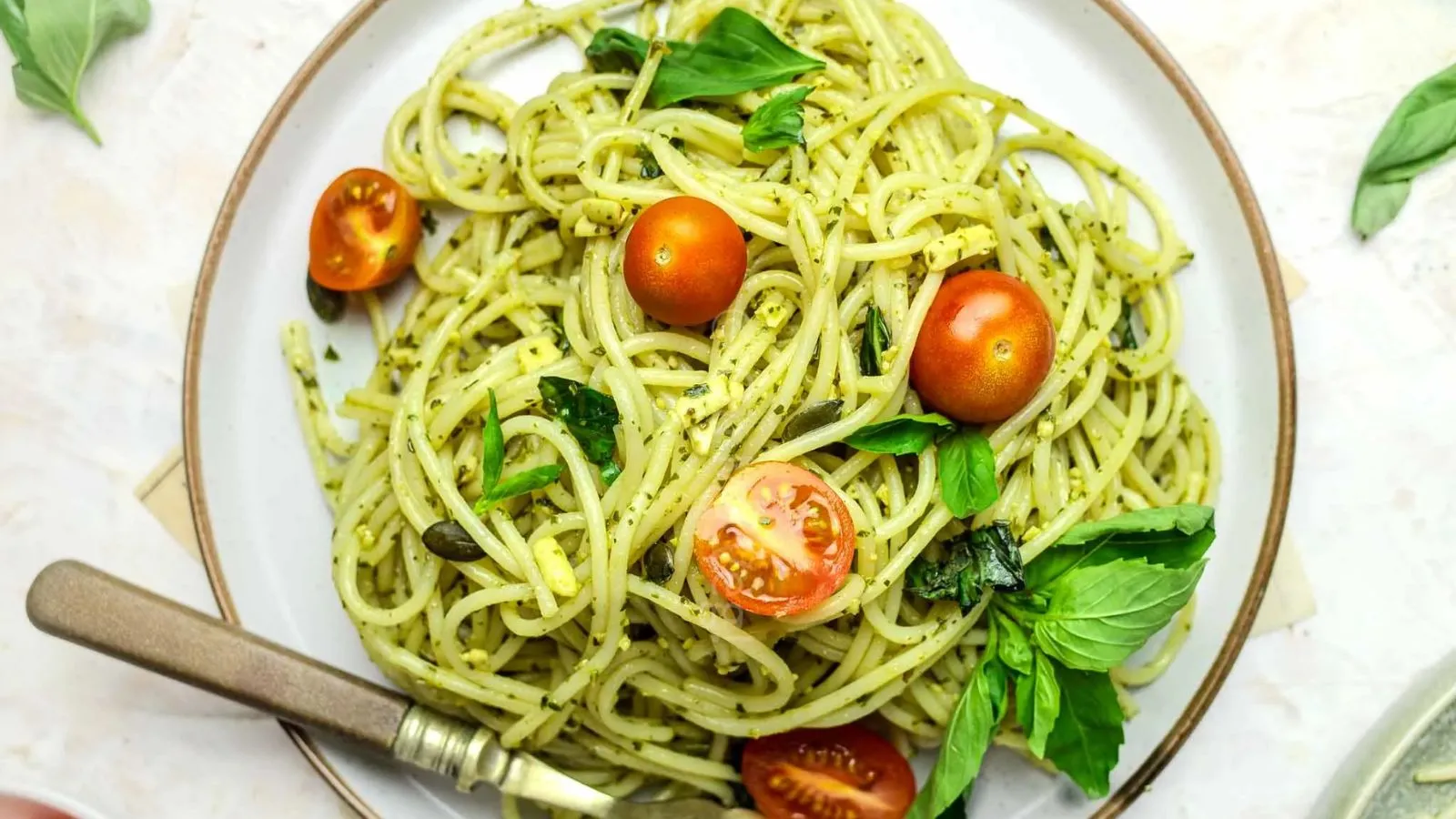 Nutty, herb-packed pesto gets tangled with spaghetti and bright cherry tomatoes. Great for when you need a fast meal that doesn’t skimp on flavor or require turning on the oven.