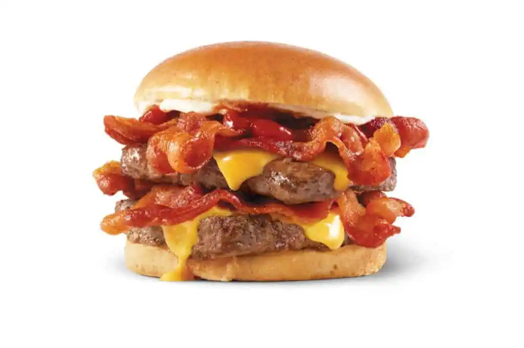 The Baconator showcases the essentials of a hearty burger, beginning with two juicy beef patties, each seared for a perfect crust while retaining a juicy interior. Six strips of crispy bacon add a smoky crunch, complementing the tender beef. A smooth layer of American cheese melts over the patties, binding everything together. Finished with a dollop of creamy mayo and ketchup, all encased in a soft, lightly toasted bun, it’s a masterful balance of savoriness and texture that appeals to true beef enthusiasts.