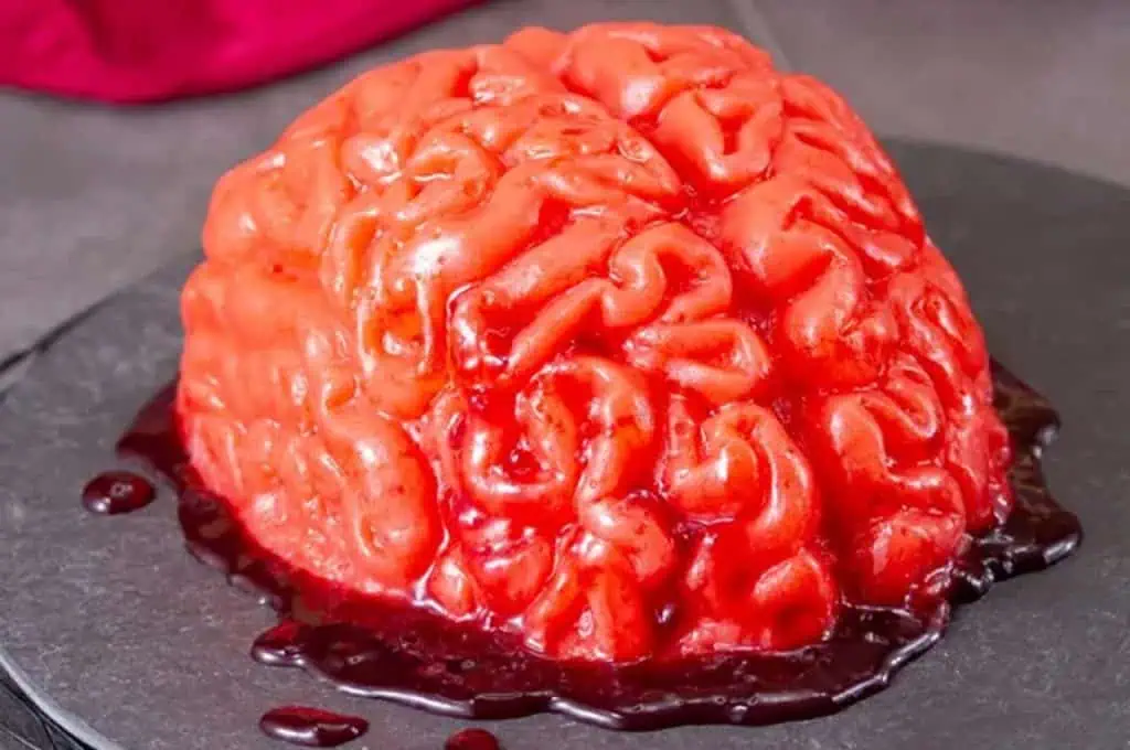 Choose a brain-shaped mold and prepare a gelatin mixture with a blend of berry juices, ensuring a rich, glossy finish. Chill until set, allowing detailed impressions for realistic textures. For the raspberry glaze, simmer fresh raspberries with sugar, straining to achieve a smooth, velvety sauce. When ready to serve, unmold the gelatin carefully onto a platter. Drizzle the raspberry glaze generously over the surface to accentuate the brain shape and deliver a tangy sweetness, enhancing both the look and taste.