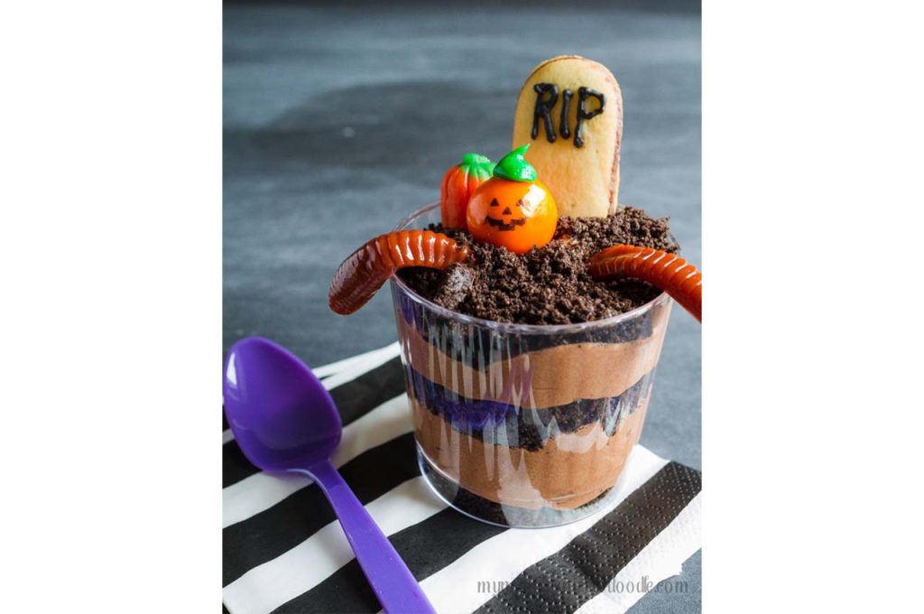 Begin with chocolate brownies or cookies, crumbling them finely to mimic soil. Prepare chocolate pudding as the creamy, indulgent base, layering it with the cookie crumble. For a spooky touch, arrange gummy worms poking out of the soil. Allow these layers to chill and meld flavors, emphasizing each spoonful's textural contrast. Serve in clear cups to showcase the layered effect, and garnish with small edible toppings like candy bones or tombstones to heighten the eerie vibe.