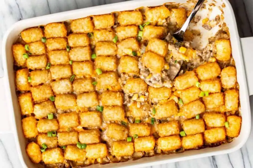 Top generously with tater tots, ensuring they cover the surface completely for an even bake. Bake until the tots are golden and crispy. The result marries textures beautifully: the crunchy tots against the savory, creamy filling provide a nostalgic yet delightful experience. It remains a timeless testament to uncomplicated comfort food.