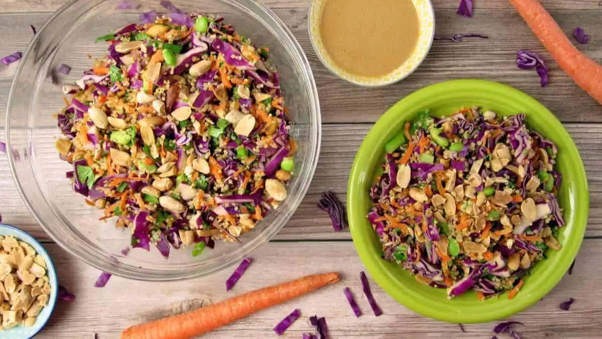 Whip up this Crunchy Thai Peanut Salad from Joyful Balance for dinner tonight. This simple recipe offers a delightful crunch and flavor in every bite. Combining peanuts, shredded cabbage, quinoa, and green onions, all mixed with a perfectly balanced sweet and savory peanut dressing.