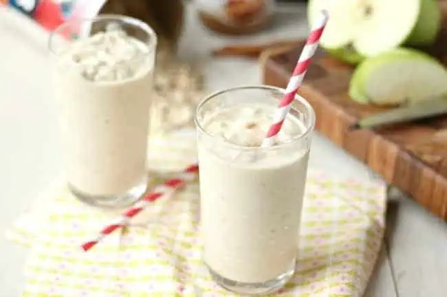 In less than 2 minutes, you can mix up a frosty green apple cookie butter oat smoothie. This creamy concoction is made with almond milk, frozen bananas, and oats.