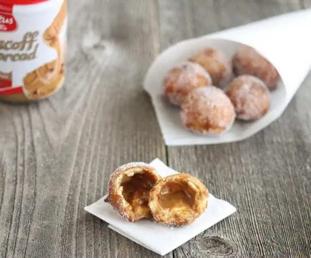 These fluffy donut holes are the perfect addition to a breakfast or afternoon snack. If you eat more than two, they are too sweet. The creamy Biscoff spread is sweet enough that just two is enough.