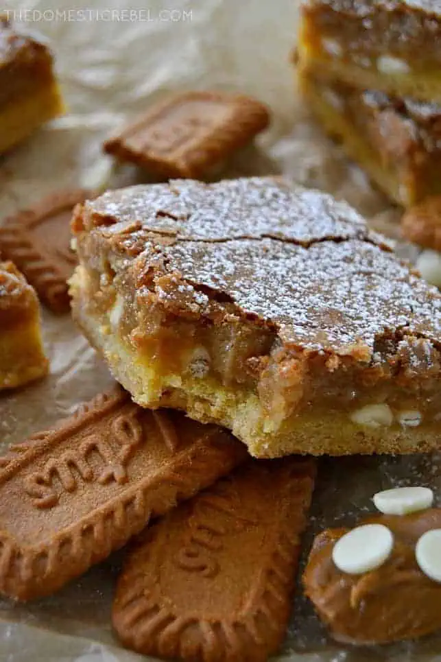 These Biscoff White Chocolate Gooey Bars are so good. They are sweet and spicy and gooey. They have white chocolate in them, too! This recipe is easy, too because it only takes a few minutes to make.
