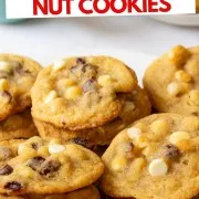Feel free to reserve 2 tablespoons of the macadamia nuts and white chocolate chips then press a couple of each into the top of the cookie dough ball before baking so there are some on top of the cookies.