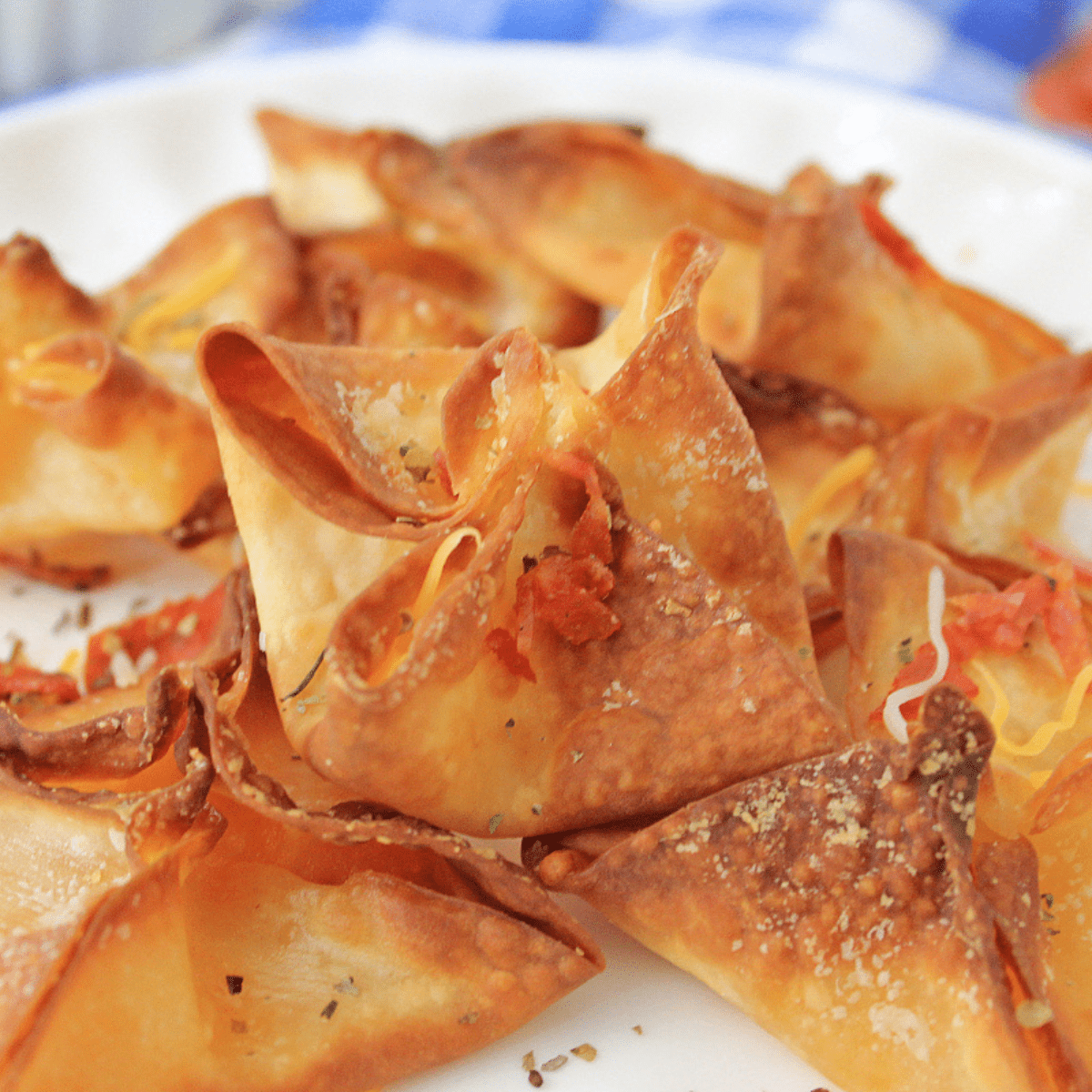 - Pinch the edges together and place the wonton in the air fryer. When the air fryer is full of wontons, spray them lightly with olive oil, and sprinkle them with Italian seasoning. Cook at 350°F for 12 minutes, flipping them halfway through.